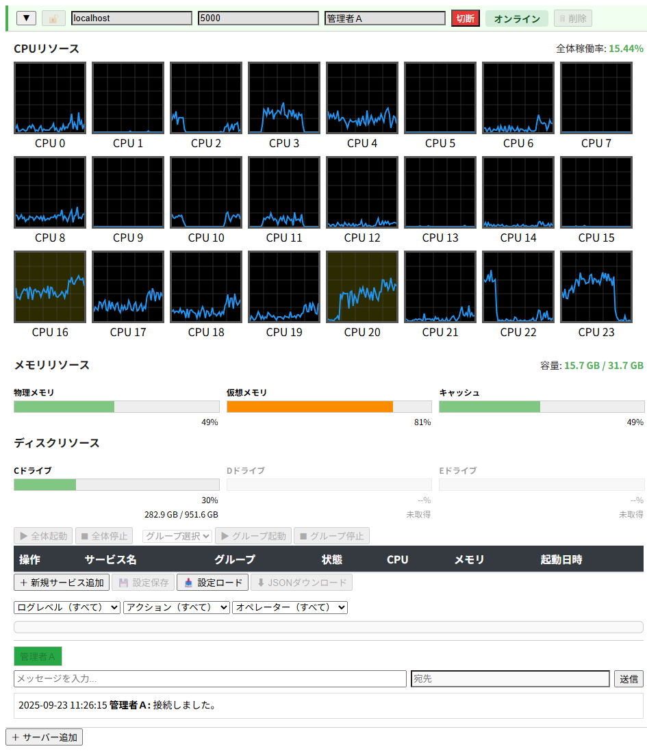 (ランチャーのポート番号はデフォルトで 5000 です) するとランチャーとの接続シーケンスが開始され、以下のように CPU/メモリ/ディスクの各リソース情報やサービス一覧/チャット画面などが表示されます。