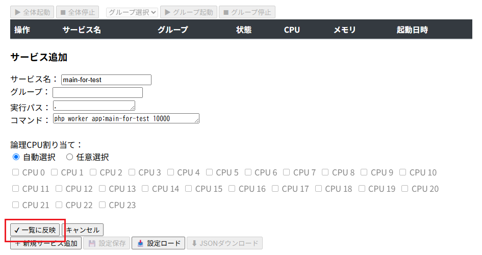 「+新規サービス追加」ボタンを押すと入力フォームが開くので、必要事項を記入してから「一覧に反映」ボタンを押します。