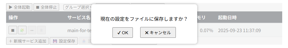 登録したサービス情報は「設定保存」ボタンを押す事で以下の確認ポップアップが表示され、「OK」ボタンを押す事で所定の場所(setting/service.json)に設定ファイルとして保存されます。保存された情報は次回以降も同じ設定で読み込まれます。