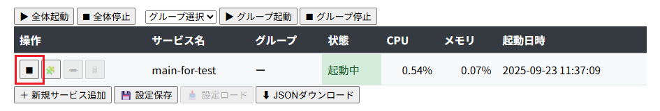 以下はサービスが起動中の画面ですが、「▶」ボタンが「■」に置き換わっているので、これを押すと停止させる事ができます。