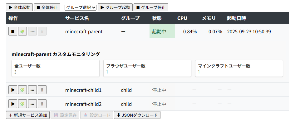 例えば、マインクラフトサーバー環境であれば「ブラウザユーザー数」「マインクラフトユーザー数」「全ユーザー数」といった利用状況をリアルタイムに可視化できます。