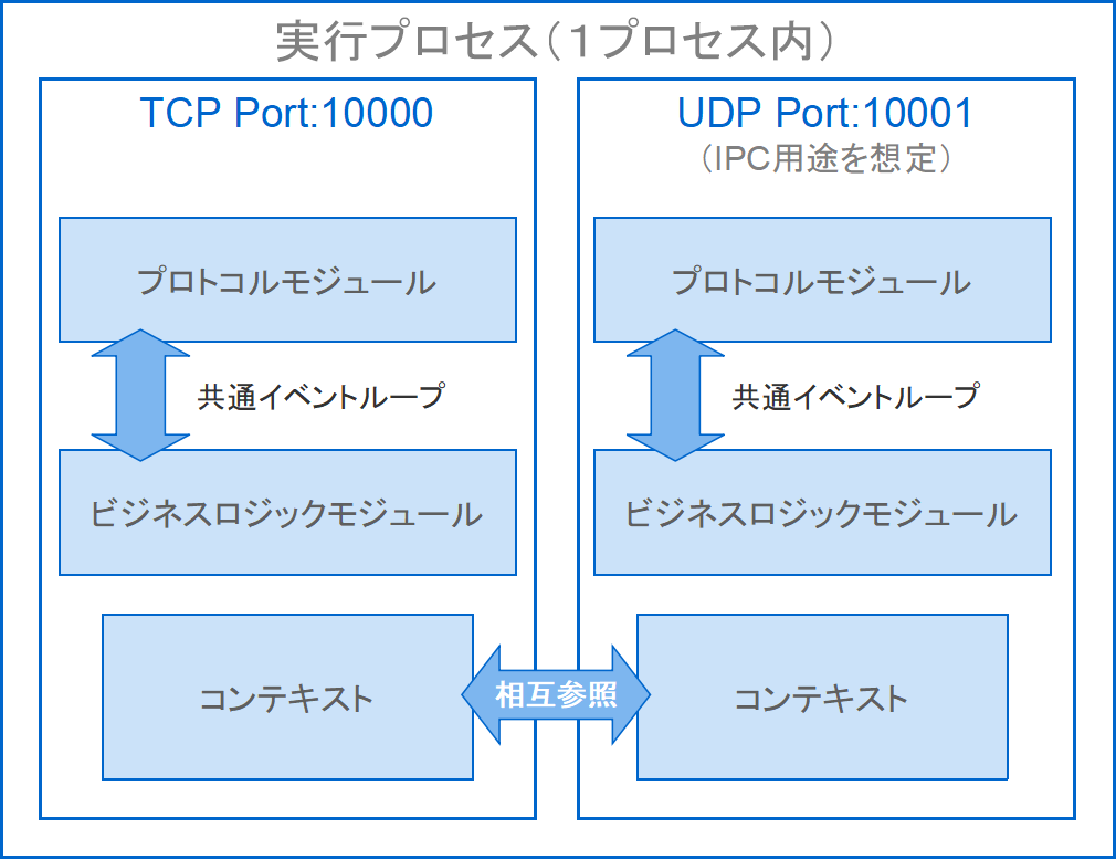 1サービス(=1プロセス)内で並列に動作する Communication(TCP)と IPC(UDP)モジュールの構造例。